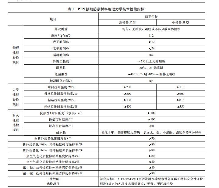 根據(jù)總干渠6 座渡槽槽身外保溫系統(tǒng)結(jié)構(gòu)、環(huán)向伸縮縫型式、內(nèi)表面結(jié)構(gòu)、滲漏水形態(tài)與狀況,以及環(huán)境狀況與長久運(yùn)行工況,參考各類水利工程引輸水建筑物結(jié)構(gòu)縫、變形縫、伸縮縫、施工縫、沉降縫、裂縫、孔洞,以及水工混凝土結(jié)構(gòu)平面滲漏水與防滲處理的成功實(shí)踐案例[2-9],通過對目前廣泛應(yīng)用、國標(biāo)與行業(yè)技術(shù)標(biāo)準(zhǔn)推薦,以及技術(shù)成熟的大量防滲漏止水材料進(jìn)行對比分析,按照適應(yīng)性與防滲漏止水性能優(yōu)良、變形性能大、耐溫性好、無腐蝕性、耐酸堿鹽腐蝕、密度小、耐水壓、抗凍脹、耐老化、可冷施工、力學(xué)性能優(yōu)異、粘結(jié)力強(qiáng)、粘結(jié)拉伸斷裂伸長率大、防異物嵌入、混凝土基面滲透、基材廣泛、基面處理簡易、施工工藝簡便快捷、無毒環(huán)保無污染、性價比高,以及盡可能不過多增加槽身重量荷載等原則,擇優(yōu)選擇采用新一代、新型以活性粉煤灰為基礎(chǔ),合成的環(huán)保型PTN 石油瀝青聚氨酯接縫防滲材料( 簡稱 PTN 接縫防滲 材 料 或 PTN 密 封 膠,國 家 發(fā) 明 專 利 號:ZL200310118992. X) ,對渡槽槽身及其環(huán)向伸縮縫進(jìn)行滲漏與防滲處理。PTN 接縫防滲材料是以粉煤灰、石油瀝青、聚醚型聚氨酯預(yù)聚體為主要成分,摻加固化劑、催化劑、抗氧化劑、紫外線吸收劑等輔料,采用特殊制.
